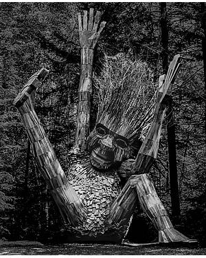 Taken on August 14, 2021, at the Boothbay Botanical Garden in Boothbay, ME of the Soren Troll statue. Created with a Pentax K1000 35mm film camera, 50mm lens, film stock Kodak TriX ISO 400, aperture f4, shutter speed 1/500 of a second, and #8 Yellow Filter.